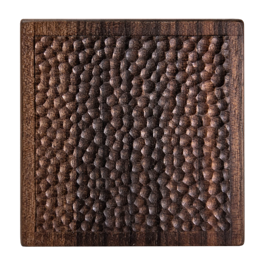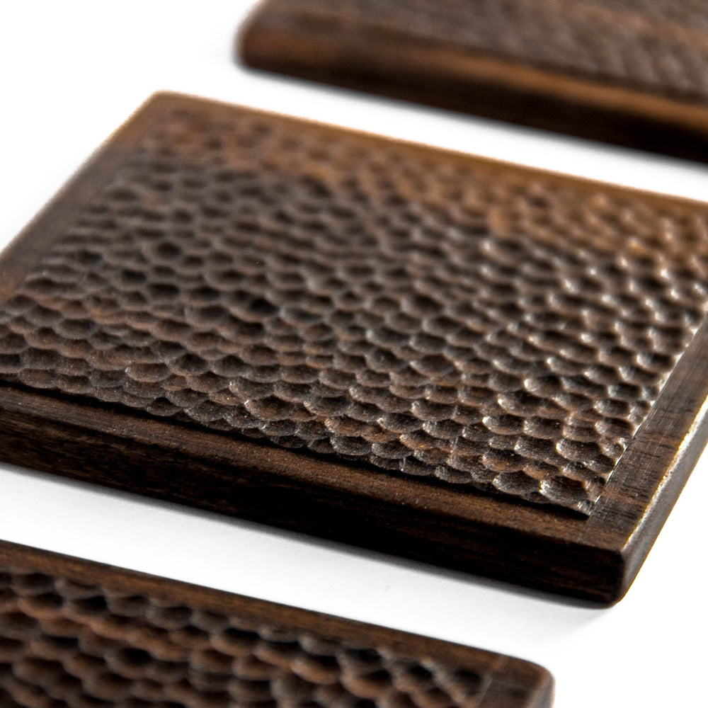 We love how much depth and movement the Sahara coasters bring into any space with its handcrafted texture. This chiseling technique makes each coaster unique and adds dimention to the natural texture of walnut. The simple form emphasizes its intense hand craftsmanship, offering a modern yet traditional look. We aim to make even the most ordinary and daily used items special for you.