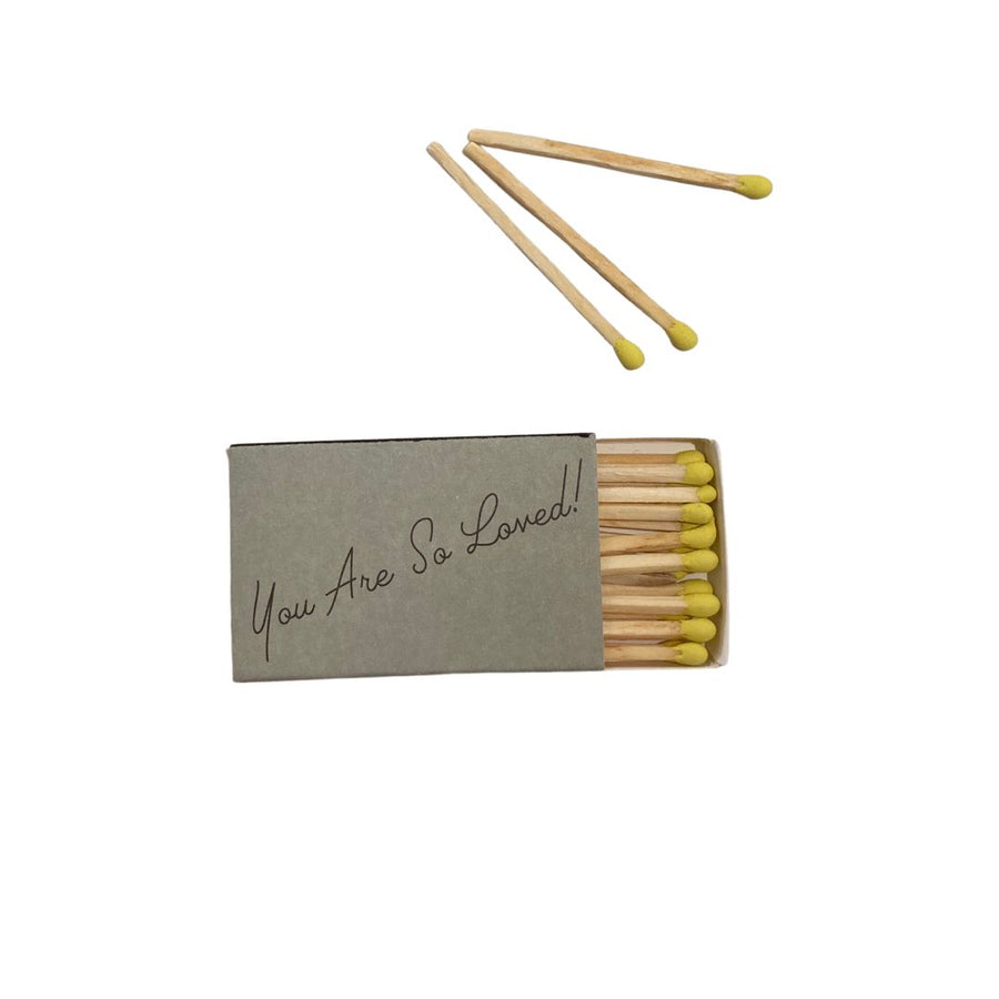 Enjoy lighting your favorite candles with these matches. ‘You Are So Loved! Gift this matchbox with the motto to yourself or someone you love! It contains approximately 18-20 pieces of 5cm long matches. It is odorless. The match tip color is yellow.